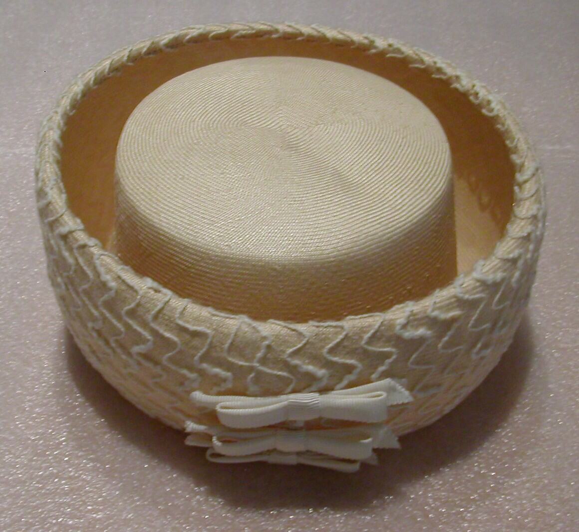 Classic pillbox with deep brim that stands vertically. Flat crown. Cream, with wool zig-zag pattern added onto trim; triple bow on one side; off-white lining