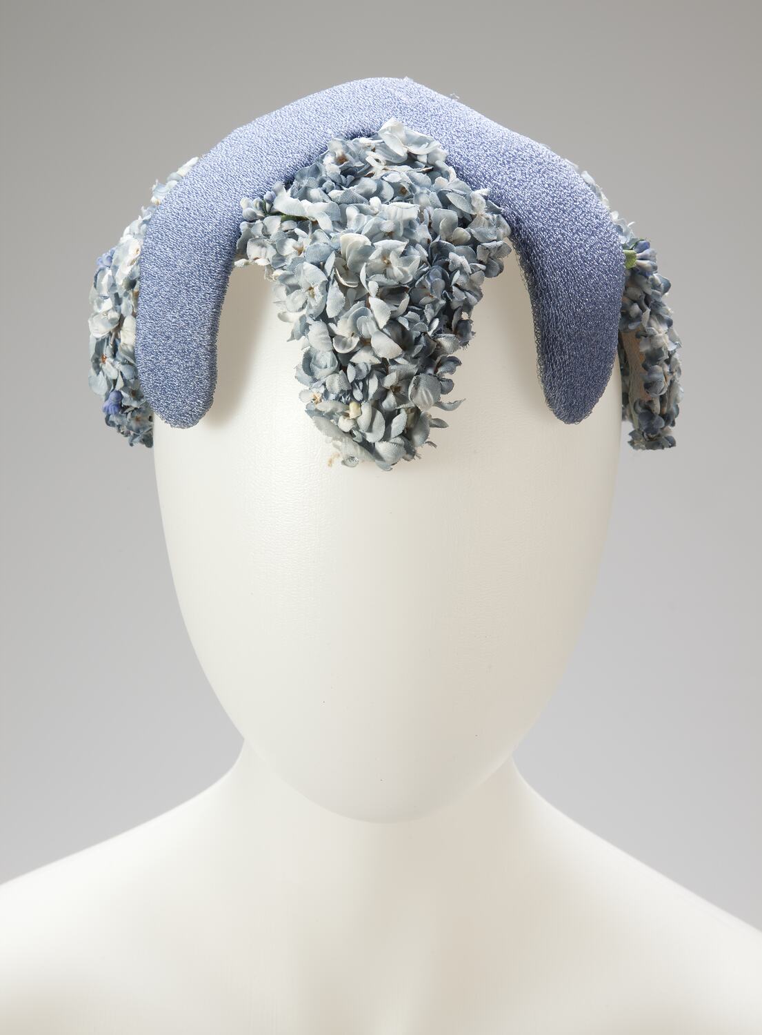 Eight-cornered hat, close-fitting to head shape. Alternate corners are decorated with small blue flowers reminiscent of hydrangeas.