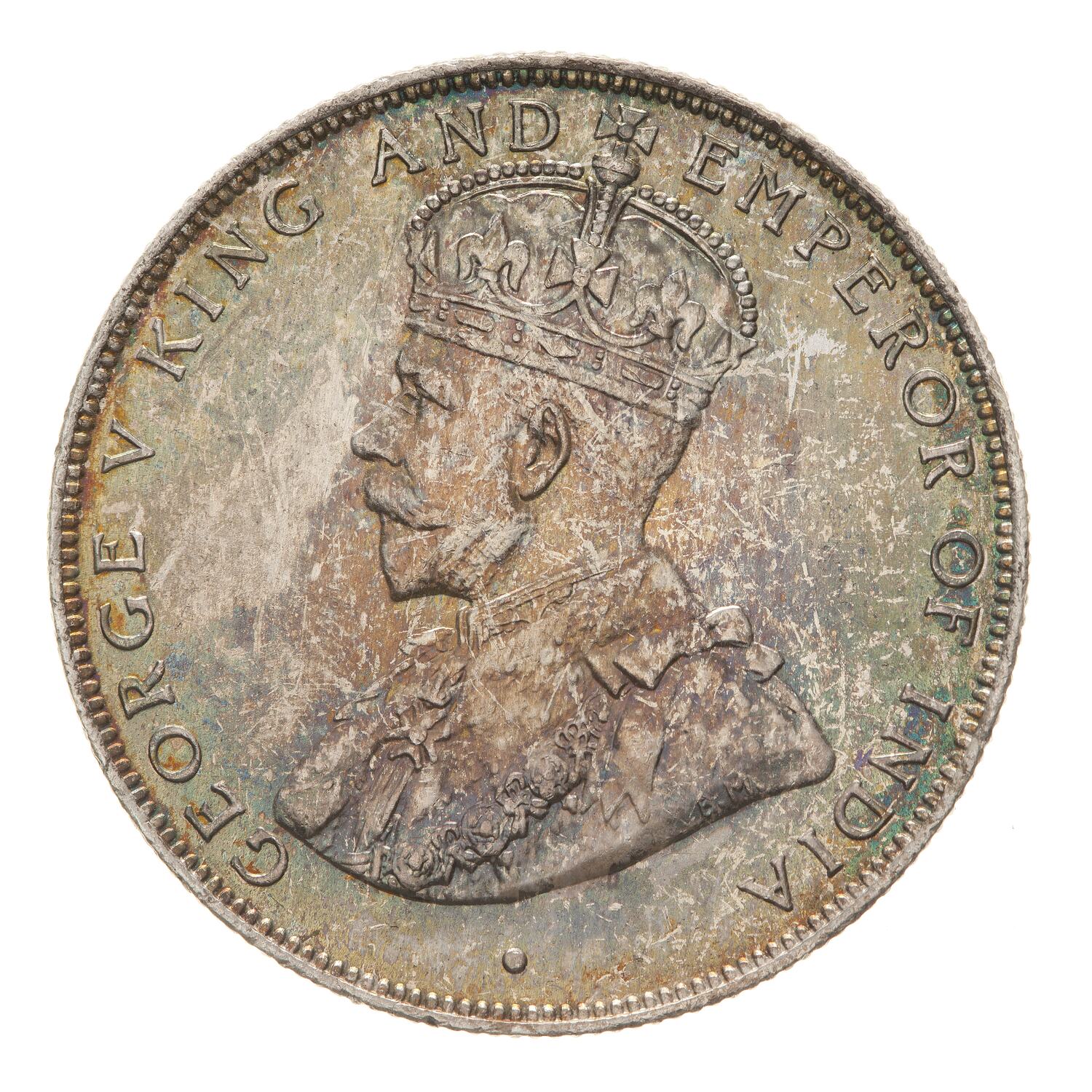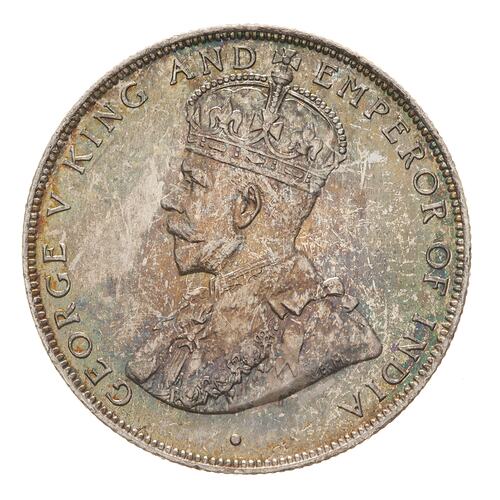 Crowned and draped bust of the King facing left, the King is wearing the Imperial Crown and the ermine Robe of State, the Collar of the Most Noble Order of the Garter, and the Badge of the Most Honourable Order of the Bath; around, GEORGE V KING AND EMPEROR OF INDIA; on bust truncation, the artist's initials, BM
