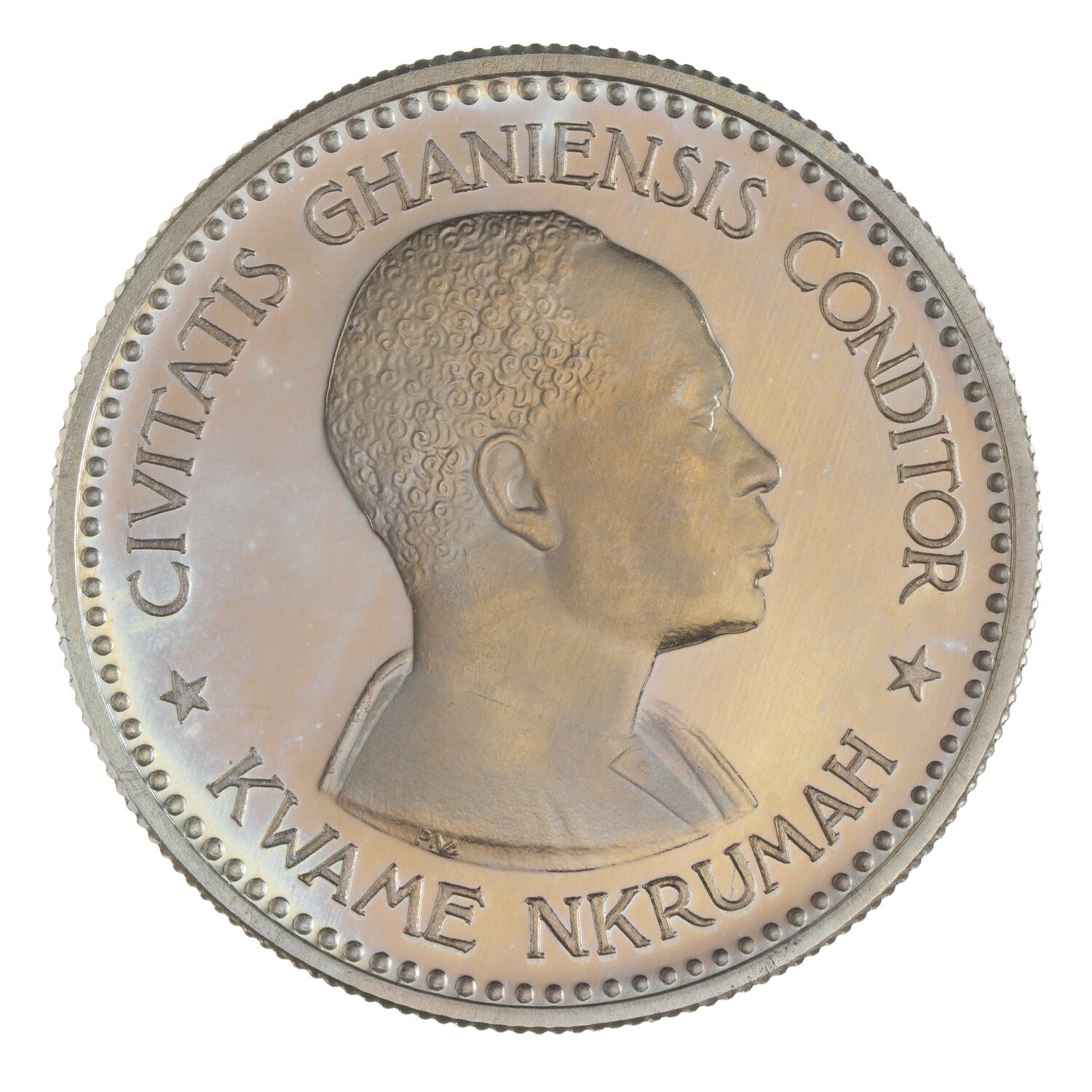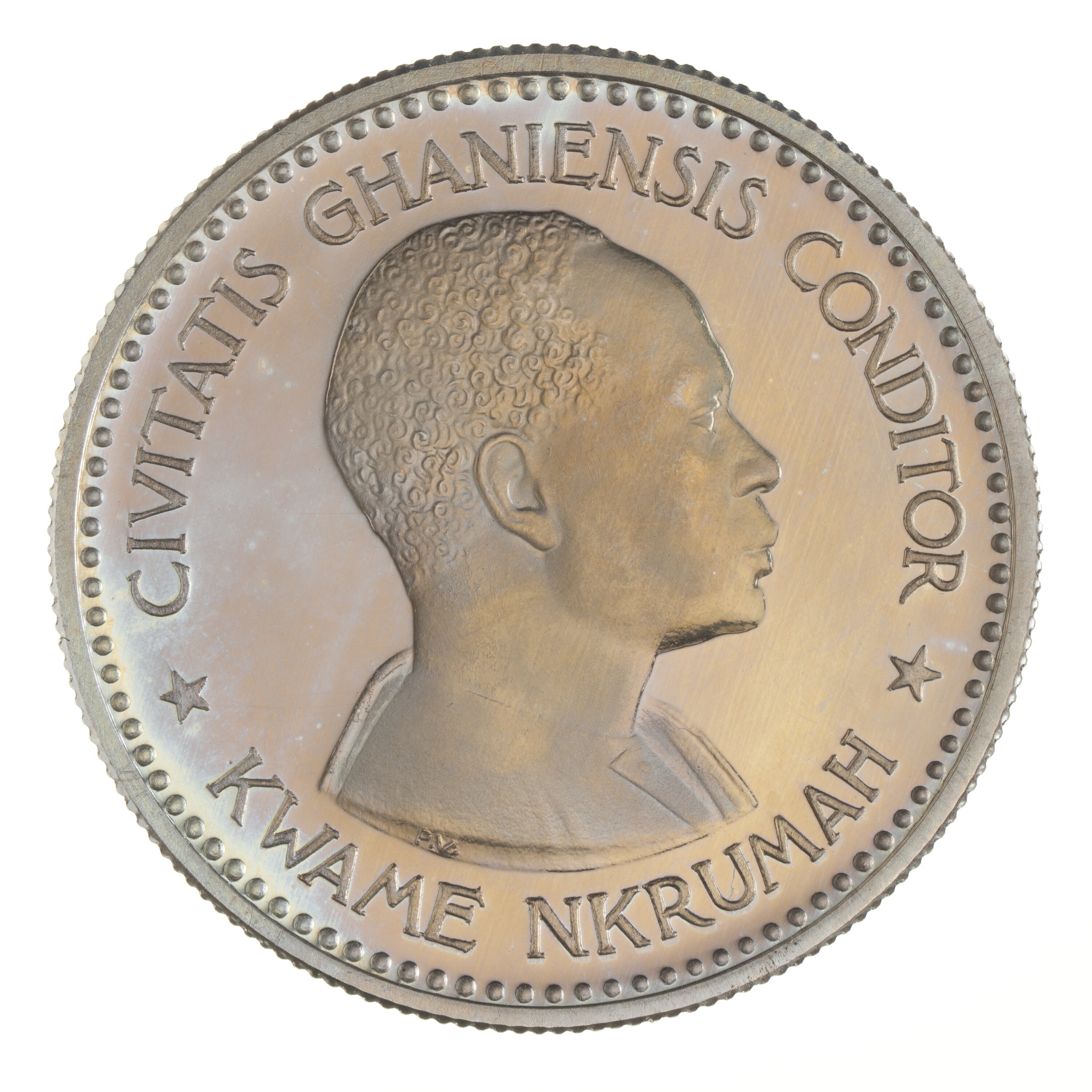 Draped bust of Dr. Kwame Nkrumah facing right; around, CIVITIS GHANIENSIS CONDITOR; around below, KWAME NKRUMAH; the artist's initials, PV, on bust truncation
