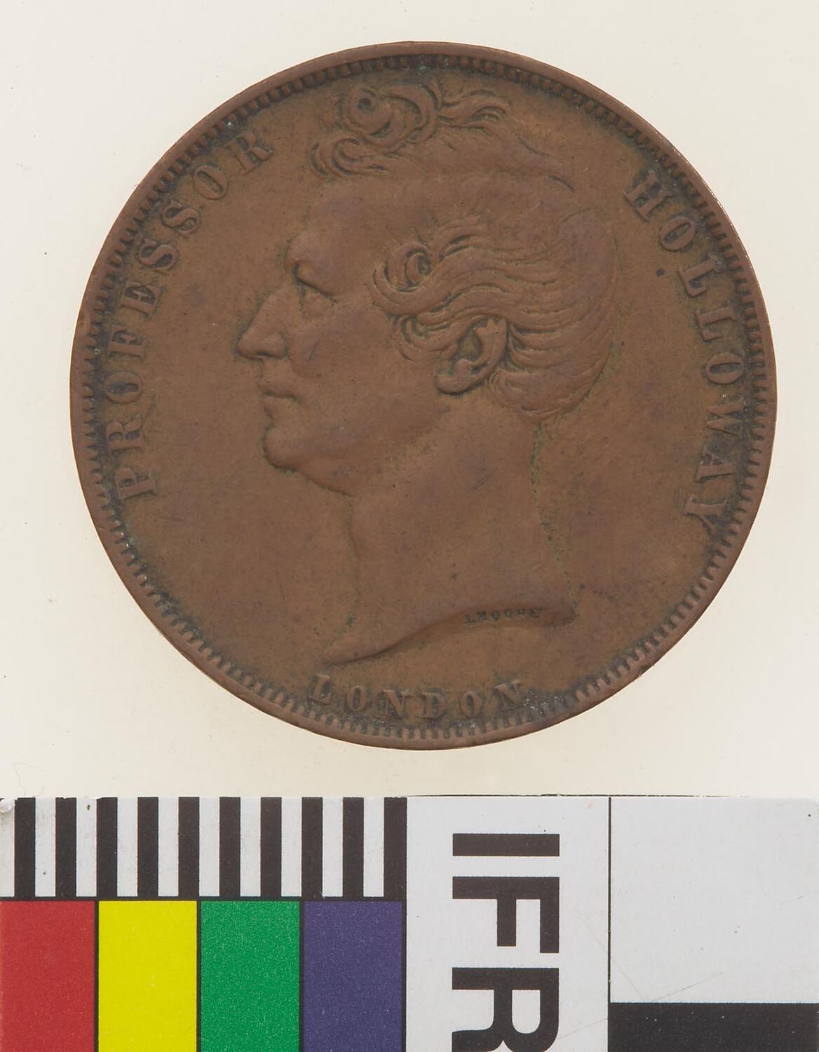 Head of Professor Holloway facing left with J. MOORE (the maker's name) incuse on neck truncation; around, PROFESSOR HOLLOWAY; below, LONDON. There is a hint of a small extra curl at the top of the forehead (perhaps a die flaw).