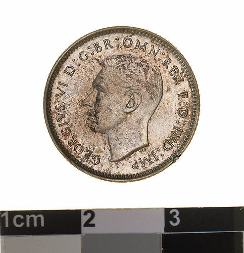 A silver coin (19 mm diameter with milled edge) featuring a bare head of George VI facing left; around, GEORGIVS VI D: G: BR: OMN: REX F: D: IND: IMP: ; below bust in small lettering the artist's initials H.P.. The reverse features the Ensigns Armorial of the Commonwealth of Australia, as authorised by Royal Warrent 7th May 1908 - composed of a simple shield enclosing a cross of Saint George on which are five six-pointed stars, around the outside of which are six small escutcheons, i.e., small shields. The shield is supported by a kangaroo and an emu standing on a grassy mound. Above the shield a crest, the seven-pointed star of Federation on a wreath. Below on a ribbon the motto ADVANCE AUSTRALIA is inscribed. Around above, SIXPENCE and below, between arrow heads, the date, 1939.