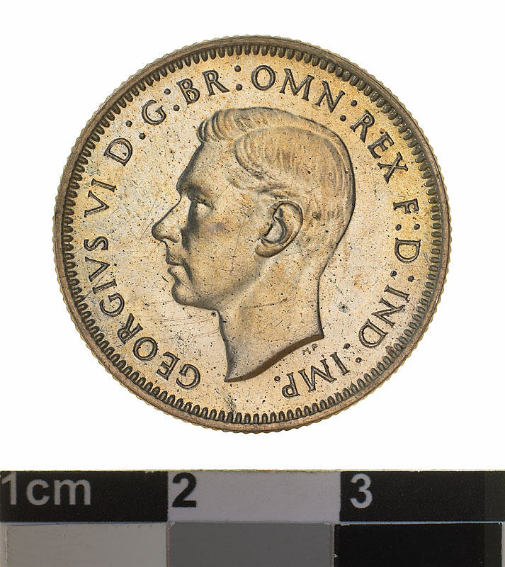 A silver coin (23.5 mm diameter with milled edge) featuring a bare head of George VI facing left; around, GEORGIVS VI D: G: BR: OMN: REX F. D. IND: IMP: ; below bust in small lettering the artist's initials H.P.. The reverse features a ram's head facing three-quarters left; around above, AUSTRALIA, around below between two Federation stars, SHILLING . 1938 . (unlike later years, there is a stop after the date on this issue) The artist's initials, KG is in the field above the star on the right.