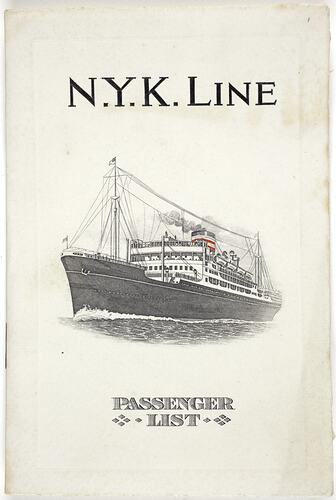 White stippled card cover featuring picture of ship on front and title NYK Line Passenger List. Eight pages including passenger information, passenger list and ports.
