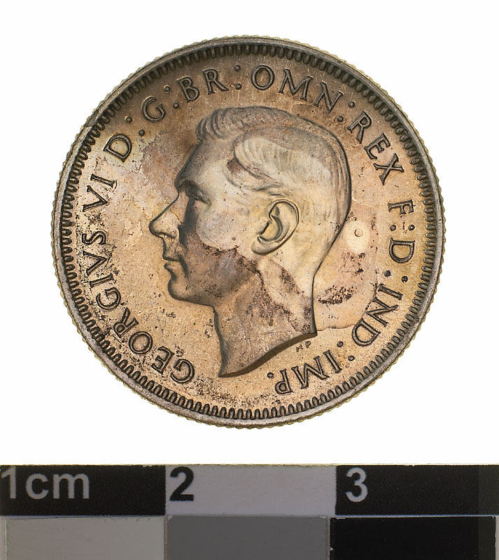 A silver coin (23.5 mm diameter with milled edge) featuring a bare head of George VI facing left; around, GEORGIVS VI D: G: BR: OMN: REX F. D. IND: IMP: ; below bust in small lettering the artist's initials H.P.. The reverse features a ram's head facing three-quarters left; around above, AUSTRALIA, around below between two Federation stars, SHILLING . 1938 . (unlike later years, there is a stop after the date on this issue) The artist's initials, KG is in the field above the star on the right.