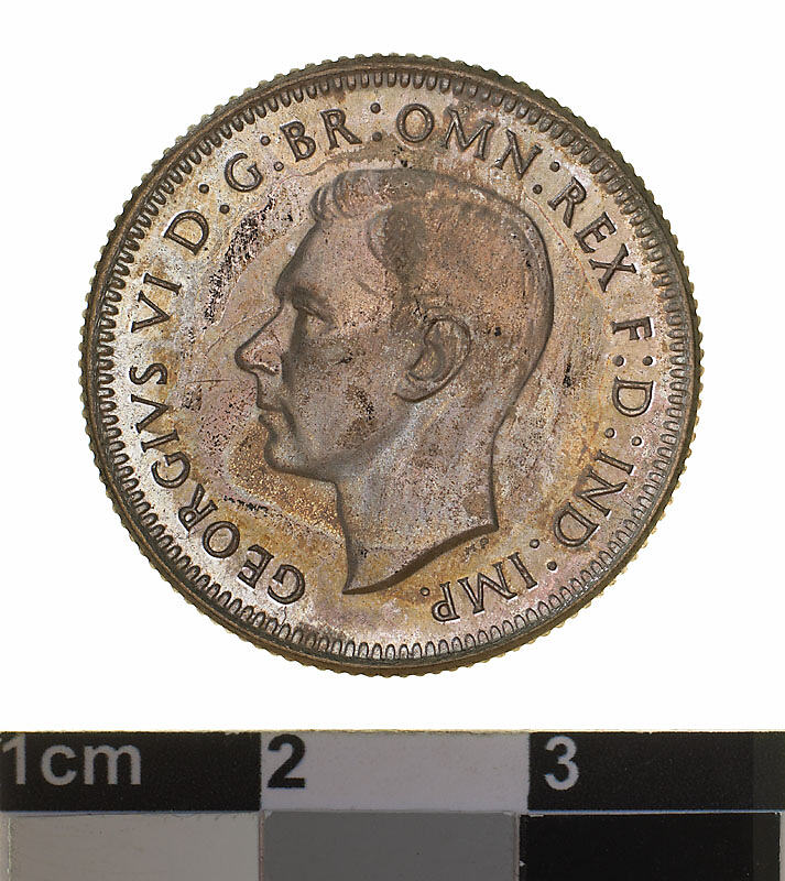 Bare head of George VI facing left; around, GEORGIVS VI D: G: BR: OMN: REX F: D: IND: IMP: The artis's initials H.P. in the field below the back of the neck.