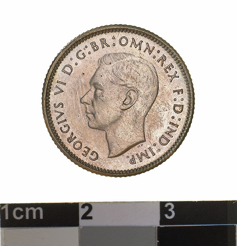A silver coin (19 mm diameter with milled edge) featuring a bare head of George VI facing left; around, GEORGIVS VI D: G: BR: OMN: REX F: D: IND: IMP: ; below bust in small lettering the artist's initials H.P.. The reverse features the Ensigns Armorial of the Commonwealth of Australia, as authorised by Royal Warrent 7th May 1908 - composed of a simple shield enclosing a cross of Saint George on which are five six-pointed stars, around the outside of which are six small escutcheons, i.e., small shields. The shield is supported by a kangaroo and an emu standing on a grassy mound. Above the shield a crest, the seven-pointed star of Federation on a wreath. Below on a ribbon the motto ADVANCE AUSTRALIA is inscribed. Around above, SIXPENCE and below, between arrow heads, the date, 1938.