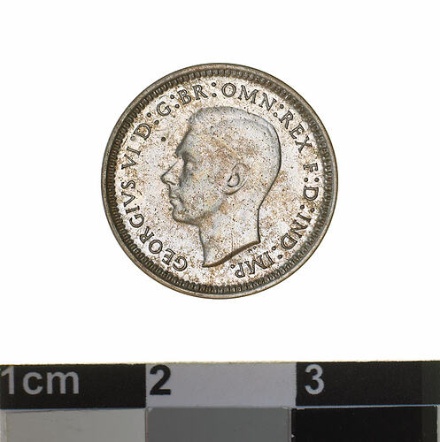 A silver coin (16 mm diameter with plain edge) featuring a bare head of George VI facing left; around, GEORGIVS VI D: G: BR: OMN: REX F: D: IND: IMP: ; below bust in small lettering the artist's initials H.P.. The reverse features three ears of wheat held by a curved ribbon. Around above, AUSTRALIA; around below divided into two by the stalks of the wheat, THREE PENCE, above, across the middle of the coin the date divided into two by the ears, 1939. The artist's initials tucked into the first and last bends in the ribbon K G