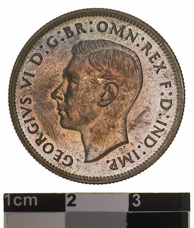 Bare head of George VI facing left; around, GEORGIVS VI D:G: BR: OMN: REX F.D. IND: IMP: ; below bust in small lettering the artist's initials H.P.