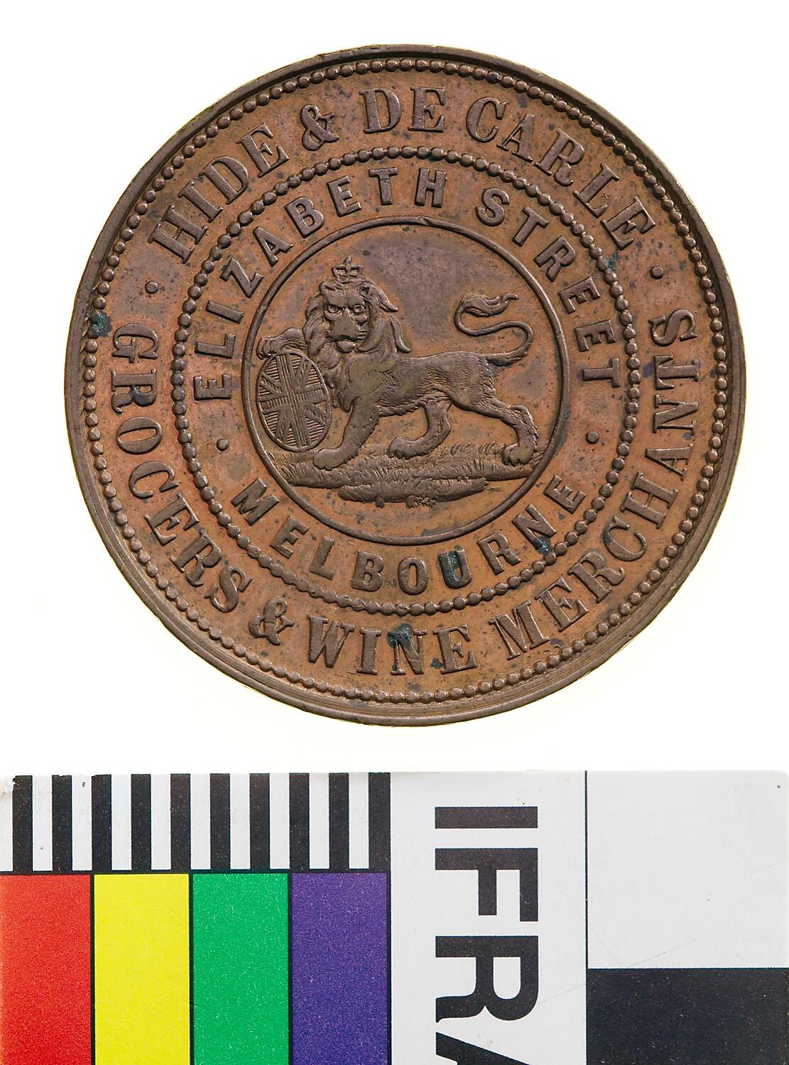 A round copper token (34 mm diameter) giving the name address and business of the issuer: Hide & DeCarle, Elizabeth St. Melbourne, Grocers and wine merchants.. The token features at centre of the obverse a male lion standing to left with head crowned facing front, its right paw is raised and rests on a shield bearing the Union Jack, its tail curved back over its body. On the reverse a female figure representing Justice seated on a wool bale with legs to left but her head and upper body to front. A wine barrel lies on the ground behind her, its end decorated with a cross to hint at a Union Jack (as found beside Britannia on the copper coins of the period). A three-masted sailing ship sails to the right on the horizon to the left. Justice wears a blindfold and extends a balanced set of scales with her right hand. With her left she holds an inverted cornucopia from which fruits flow onto the ground. She wears an ancient-style of flowing dress bound at the waist, her left arm bare and right draped to near the elbow. It bears the date 1858. Drops of ink on reverse - one across face of Justice.