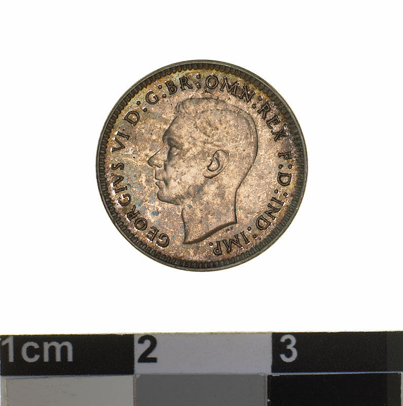 A silver coin (16 mm diameter with plain edge) featuring a bare head of George VI facing left; around, GEORGIVS VI D: G: BR: OMN: REX F: D: IND: IMP: ; below bust in small lettering the artist's initials H.P.. The reverse features three ears of wheat held by a curved ribbon. Around above, AUSTRALIA; around below divided into two by the stalks of the wheat, THREE PENCE, above, across the middle of the coin the date divided into two by the ears, 1938. The artist's initials tucked into the first and last bends in the ribbon K G