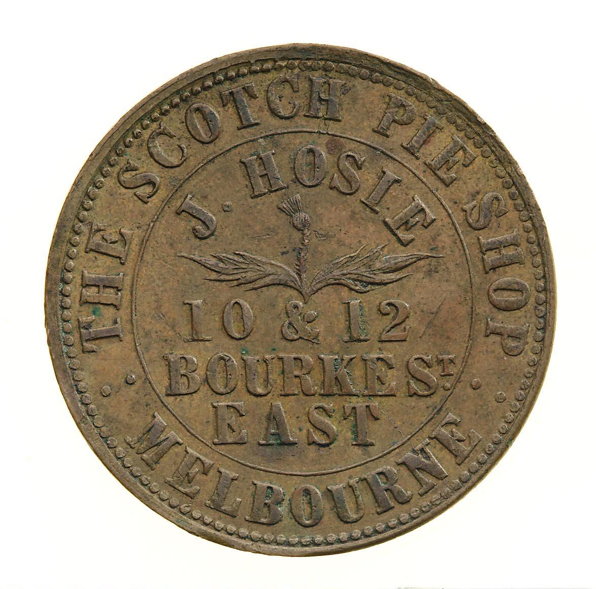 Obverse: J. HOSIE 10 & 12 BOURKE ST. EAST THE SCOTCH PIE SHOP MELBOURNE Reverse: VICTORIA 1862 ADVANCE VICTORIA T. STOKES MAKER 100 COLLINS STREET EAST MELBOURNE