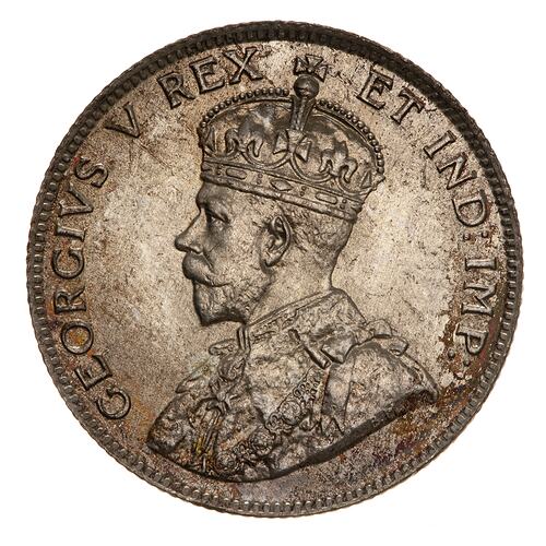 Crowned and draped bust of the King facing left, the King is wearing the Imperial Crown and the ermine Robe of State, the Collar of the Most Noble Order of the Garter, and the Badge of the Most Honourable Order of the Bath; around, GEORGIVS V REX ET IND: IMP:; artist's initial's, BM, on bust truncation