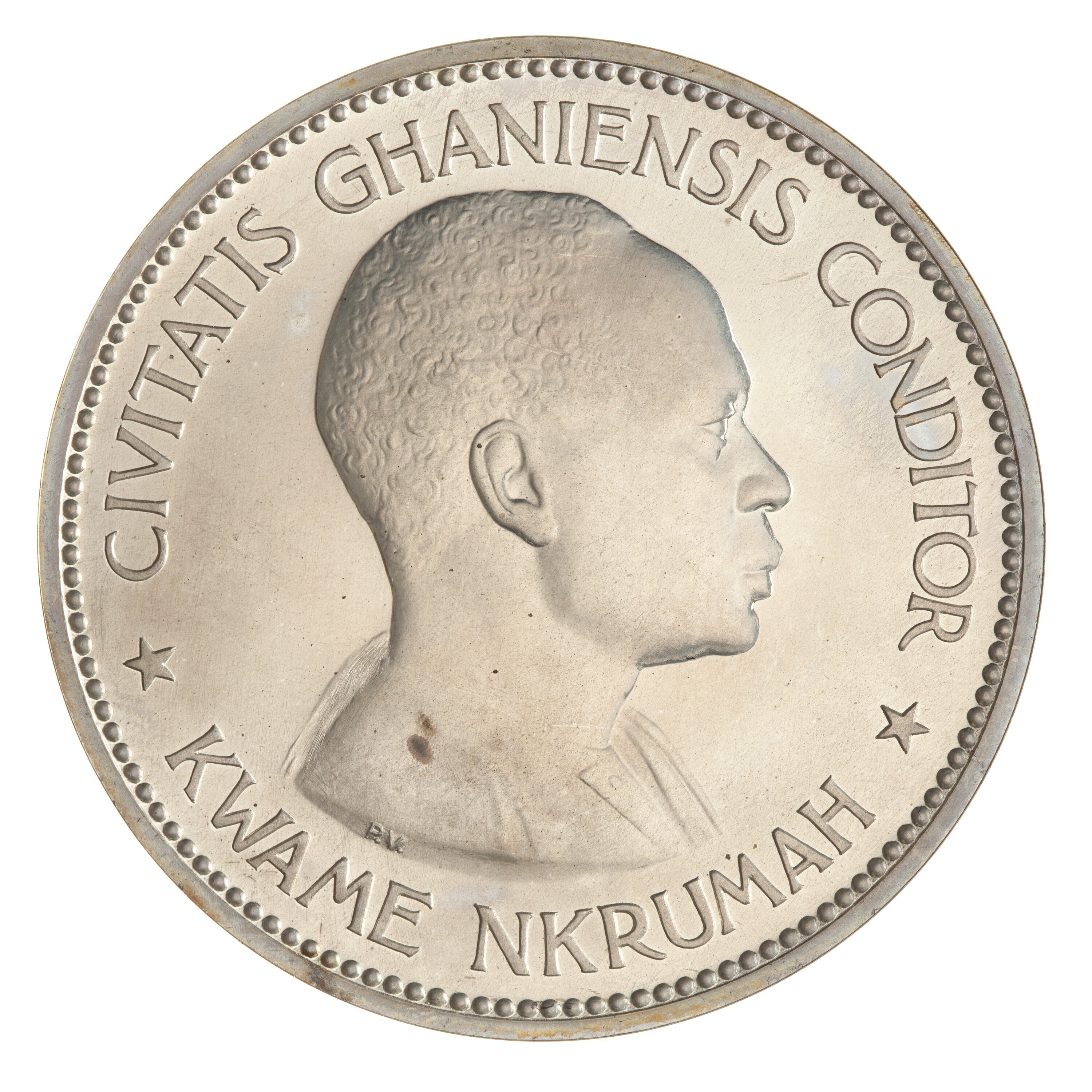 Draped bust of Dr. Kwame Nkrumah facing right; around, CIVITIS GHANIENSIS CONDITOR; around below, KWAME NKRUMAH; the artist's initials, PV, on bust truncation