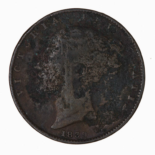 Head of the Queen facing left, hair bound in double fillet gathered behind in a knot from which a loose curl; on neck truncation raised, W.W. (for William Wyon, who designed and engraved the dies); around, VICTORIA DEI GRATIA; below, 1839