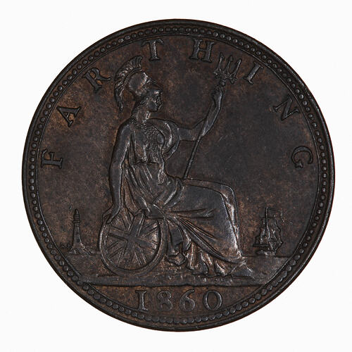 Britannia seated facing right on a rock wearing a helmet and breastplate with flowing dress; she holds a trident and rests her right hand on a shield which bears the combined crosses of the Union Flag; at right a ship sailing away; at left, a lighthouse; around, FARTHING; in exergue, 1860