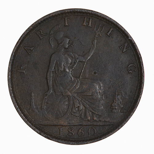 Britannia seated facing right on a rock wearing a helmet and breastplate with flowing dress; she holds a trident and rests her right hand on a shield which bears the combined crosses of the Union Flag; at right a ship sailing away; at left, a lighthouse; around, FARTHING; in exergue, 1860. Toothed border.