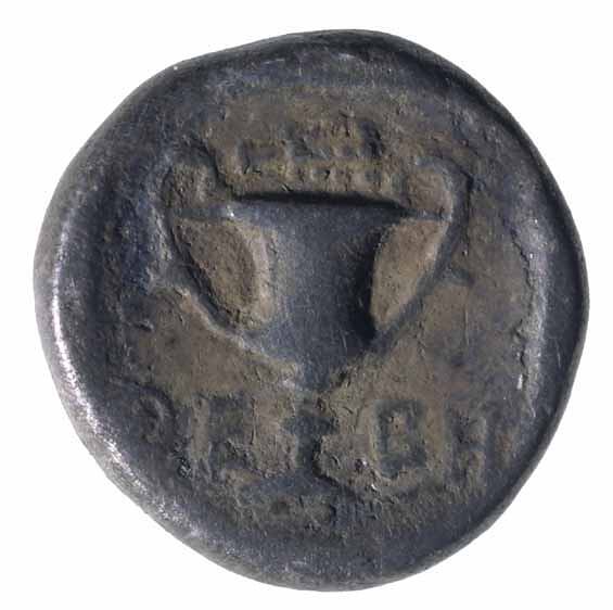 Kantharos with club above and base dividing the Greek letters {THE BE}