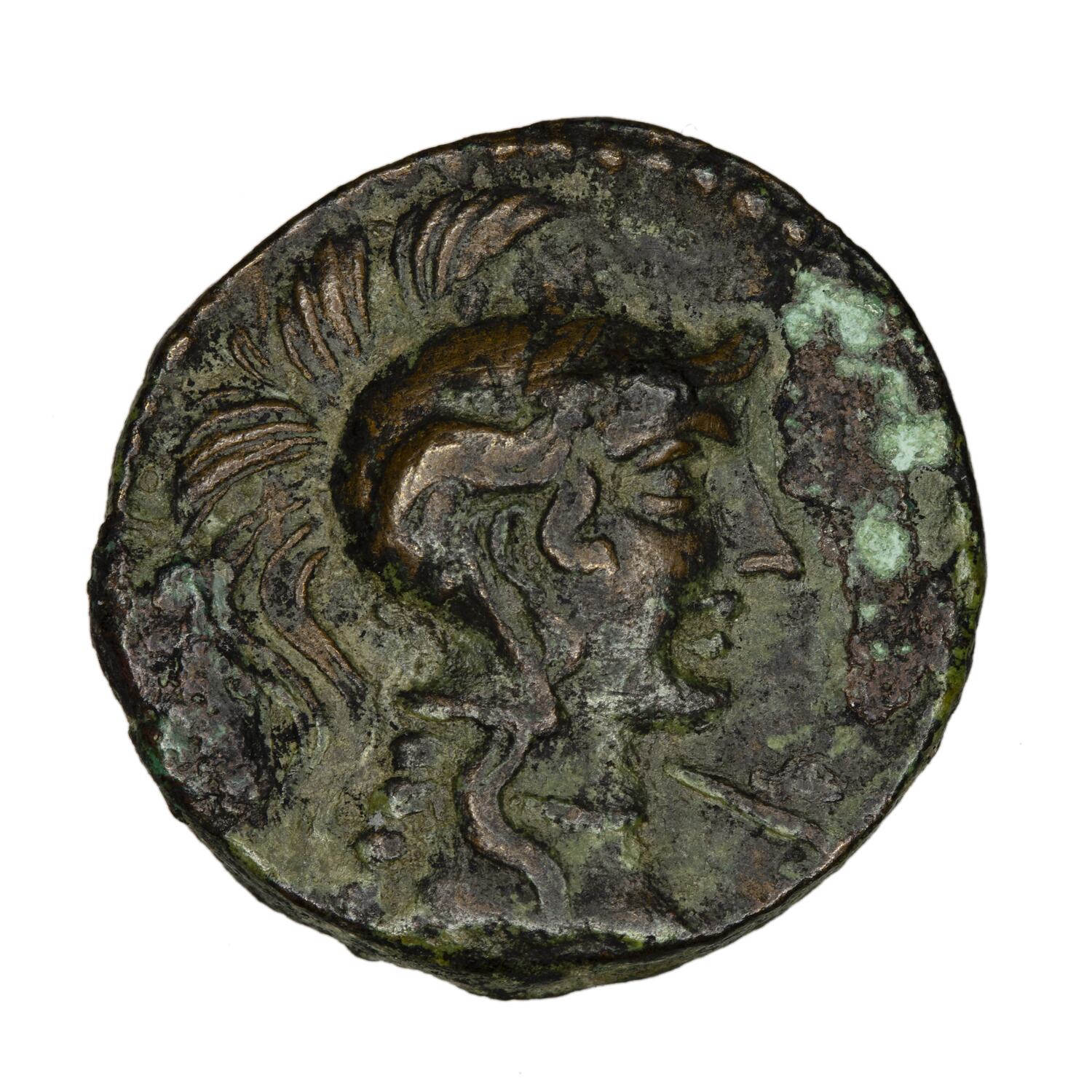 A copper coin issued by the city of Athens in Attica in the period 117-161 AD.