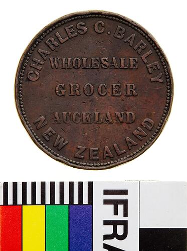 Obverse: CHARLES C. BARLEY WHOLESALE GROCER AUCKLAND NEW ZEALAND Reverse: GOD SAVE THE QUEEN 1858