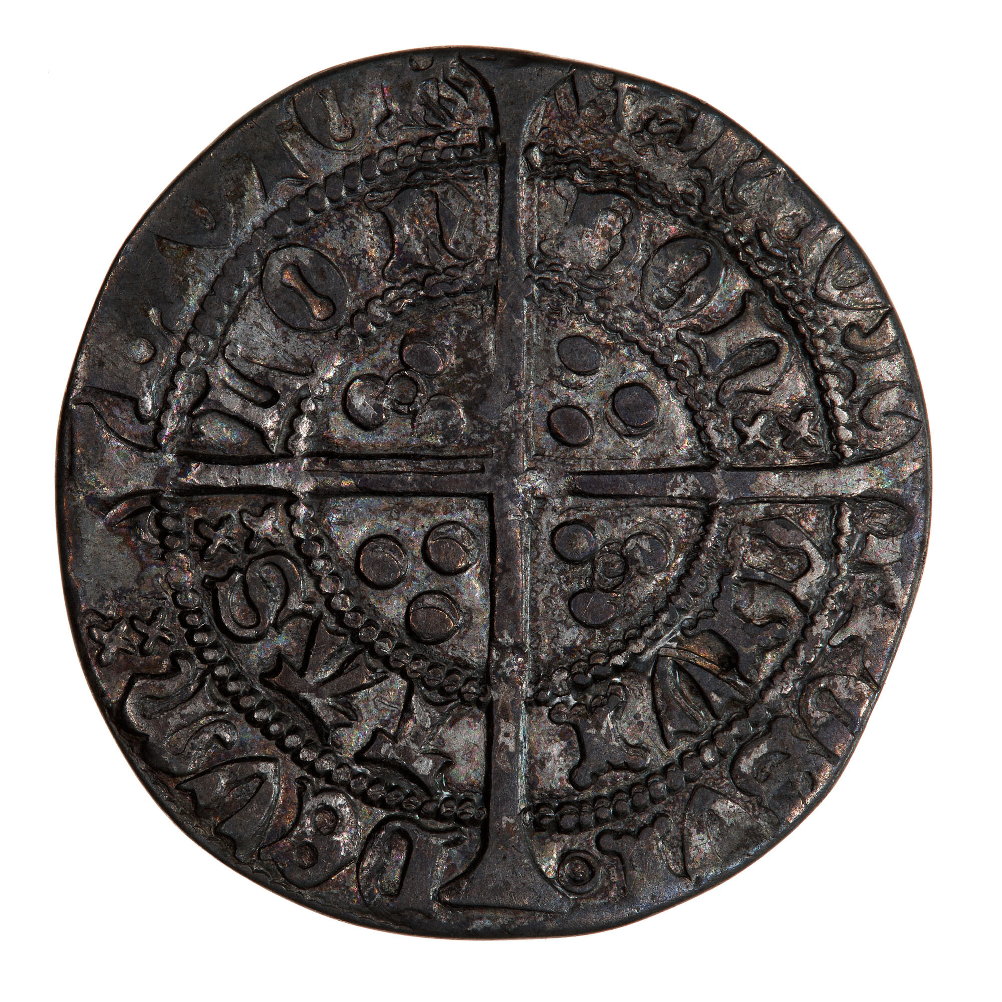 A long cross pattee dividing the legend, three pellets in each arm two of which contain an annulet; around in two concentric circles, (mm cross I) POSVI DEVM ADIVTORE MEVM - CIVITAS LONDON (annulet after POSVI) (translation: I have made God my helper)