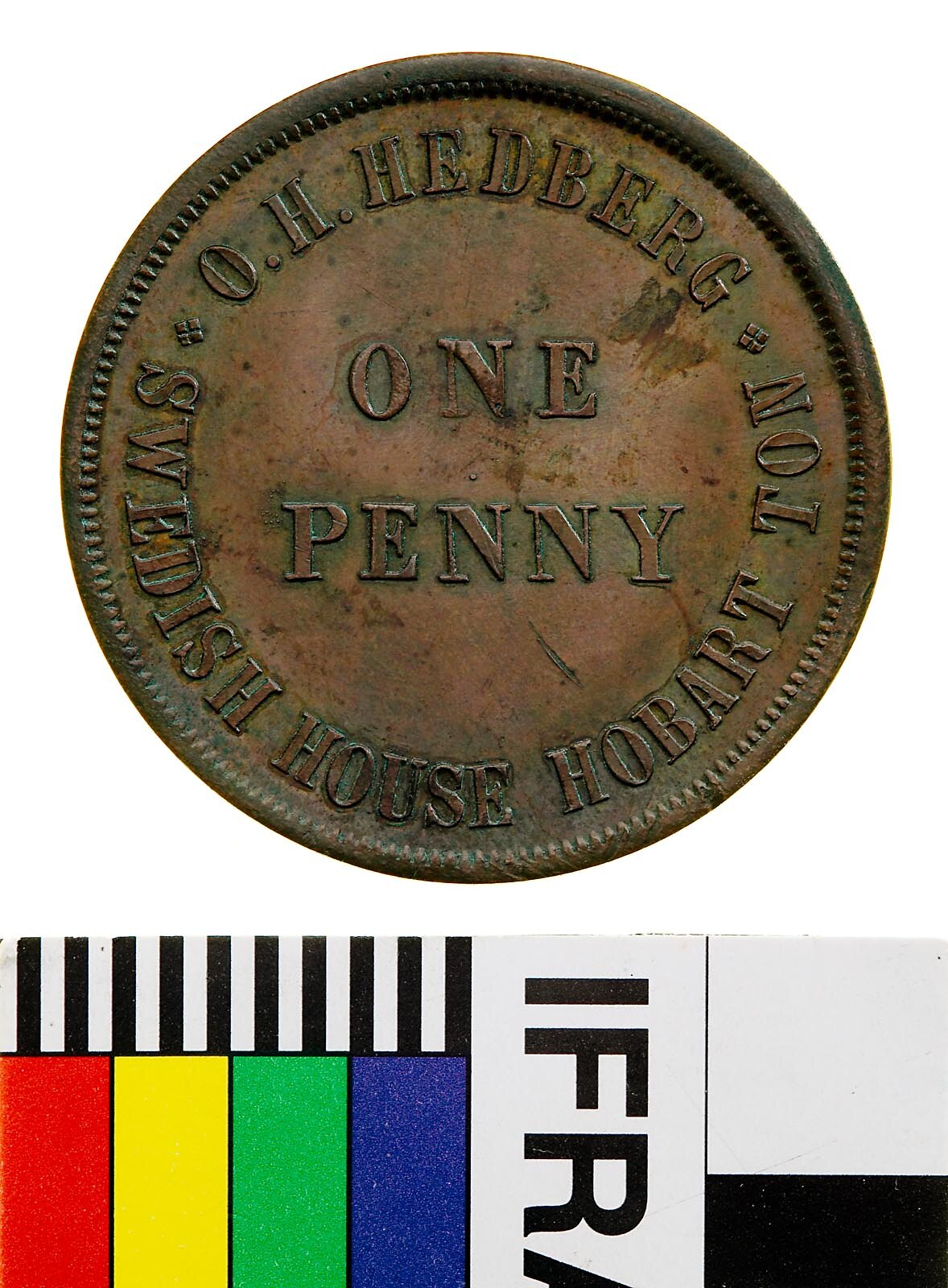 Obverse: O.H. HEDBERG SWEDISH HOUSE HOBART TON ONE PENNY Reverse: AUSTRALIA W.J. TAYLOR LONDON