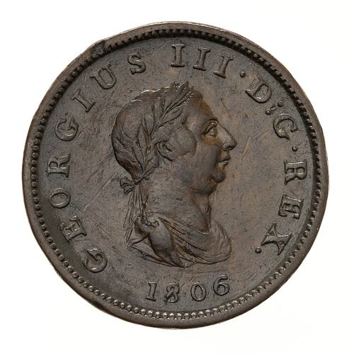 Bust of George III facing right; around, GEORGIUS III.D:G.REX. 1806; on bust truncation the artist's initial, K.