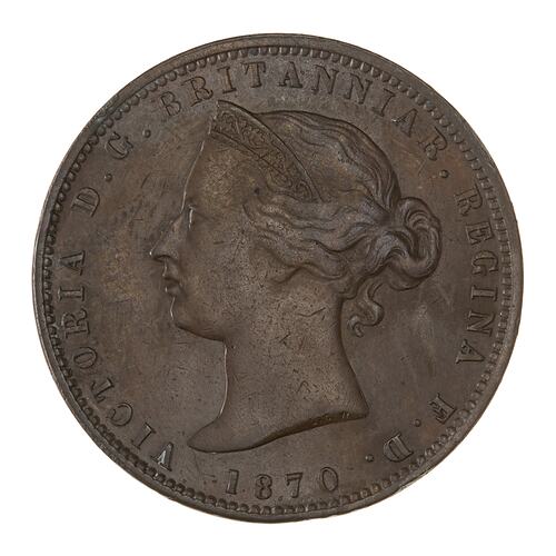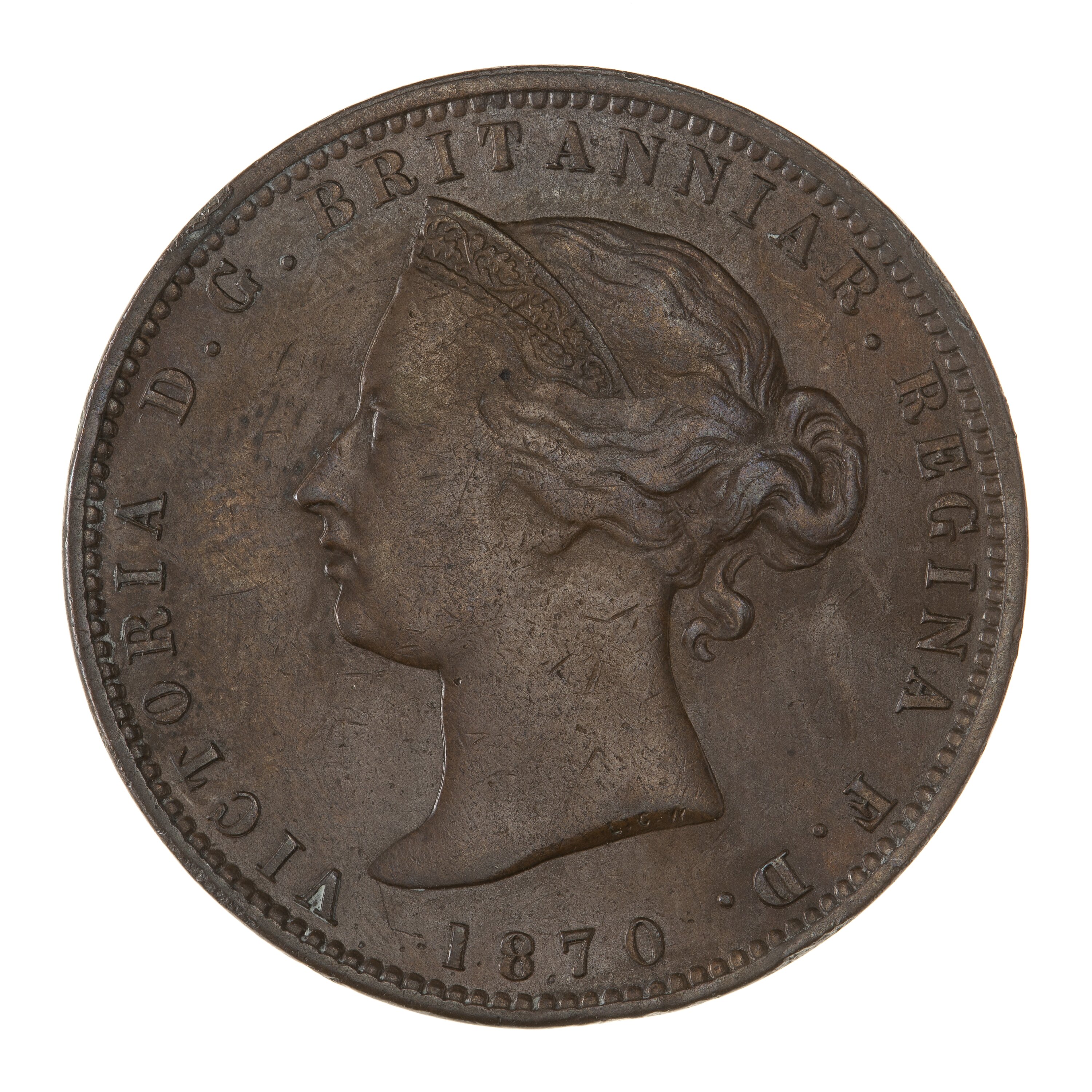 Head of the Queen wearing a coronet decorated with oak leaves facing left; around, VICTORIA D.G. BRITANNIAR. REGINA F.D.; below, 1870; the artist's initials, L.C.W, incuse on neck truncation