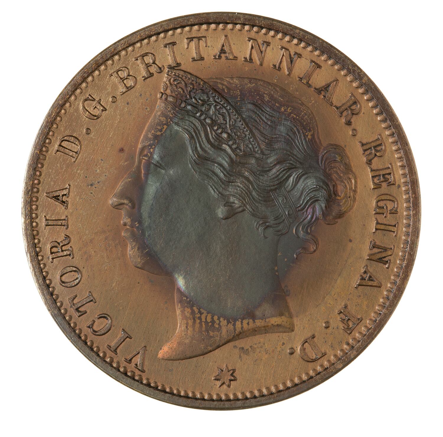 Head of the Queen facing left wearing coronet ornamented with oak leaves; around, VICTORIA D:G: BRITANNIAR: REGINA F:D:; below, a star