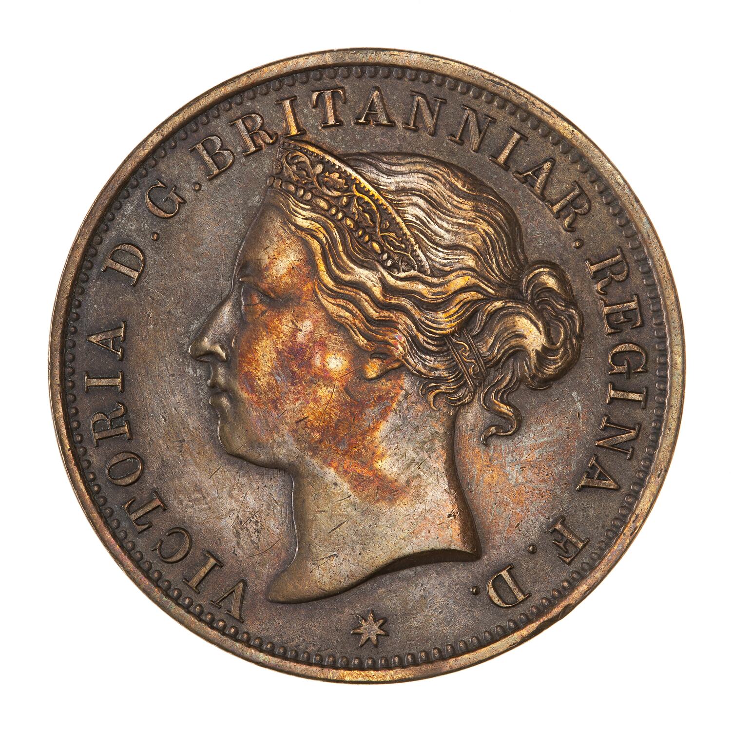 Head of the Queen facing left wearing coronet ornamented with oak leaves; around, VICTORIA D:G: BRITANNIAR: REGINA F:D:; below, a star