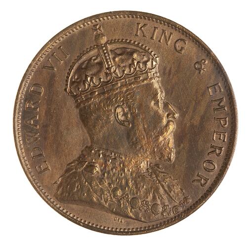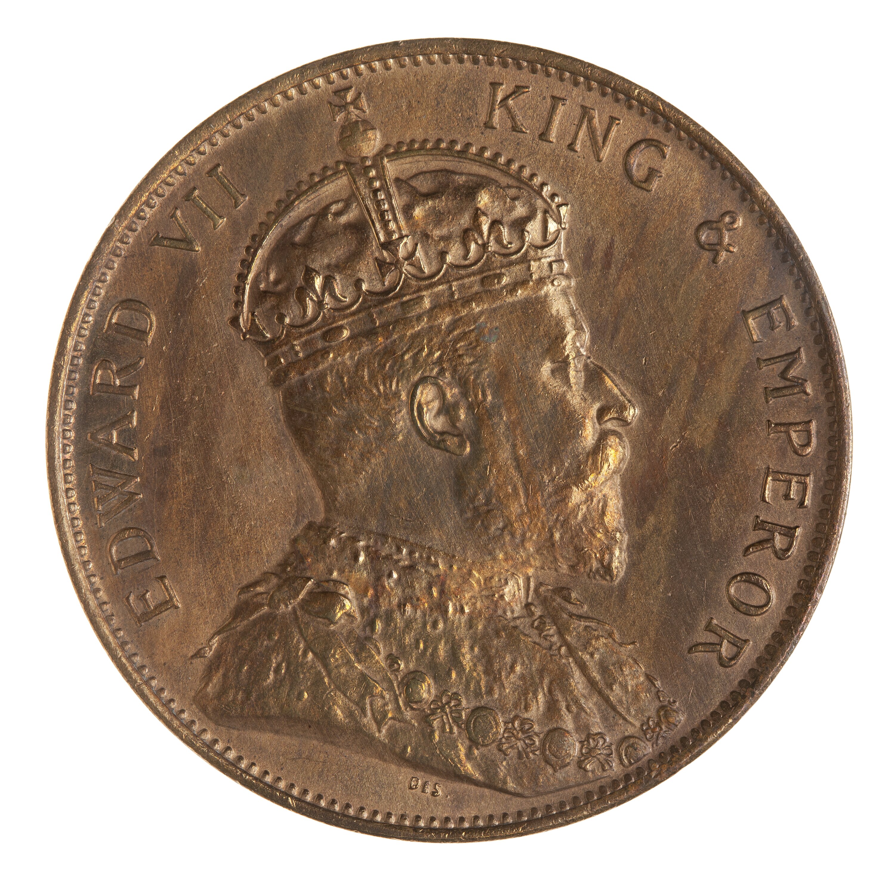 Crowned and draped bust of the King facing right; around, EDWARD VII KING & EMPEROR; the artist's initials, DES, below bust