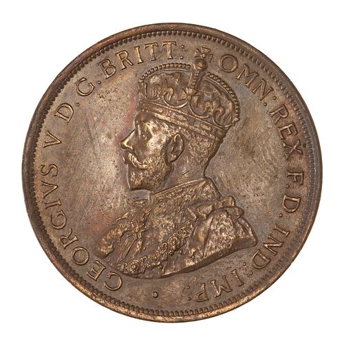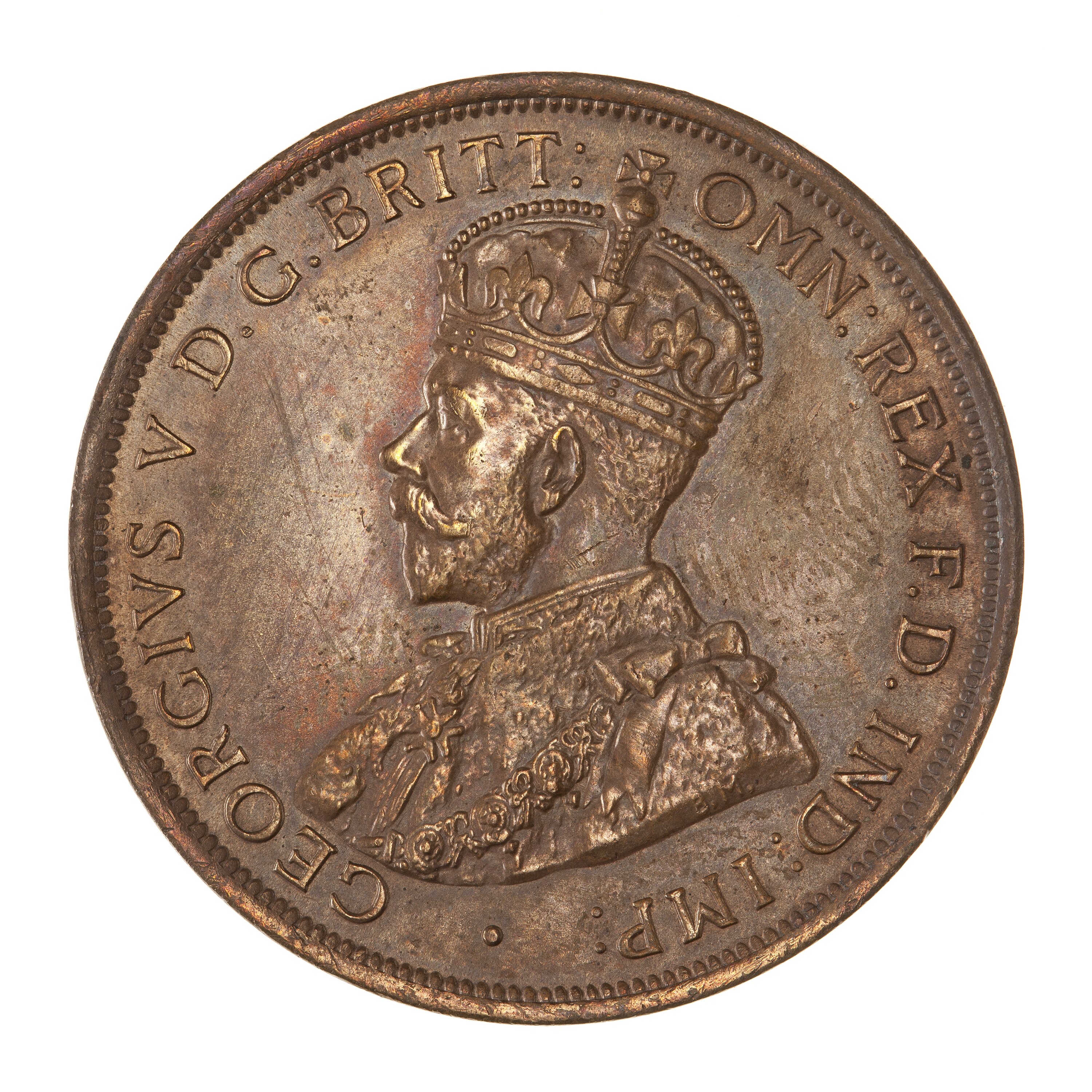 Crowned and draped bust of the King facing left, the King is wearing the Imperial Crown and the ermine Robe of State, the Collar of the Most Noble Order of the Garter, and the Badge of the Most Honourable Order of the Bath; around, GEORGIVS V D.G. BRITT: OMN: REX F.D. IND: IMP:; the artist's initials, BM, on the bust truncation