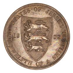 Plain Heater-shaped shield charged with three lions, passant guardant in pale (ie. walking to left with heads facing viewer arranged beneath one another) dividing the date 1909; around, STATES OF JERSEY ONE TWELFTH OF A SHILLING