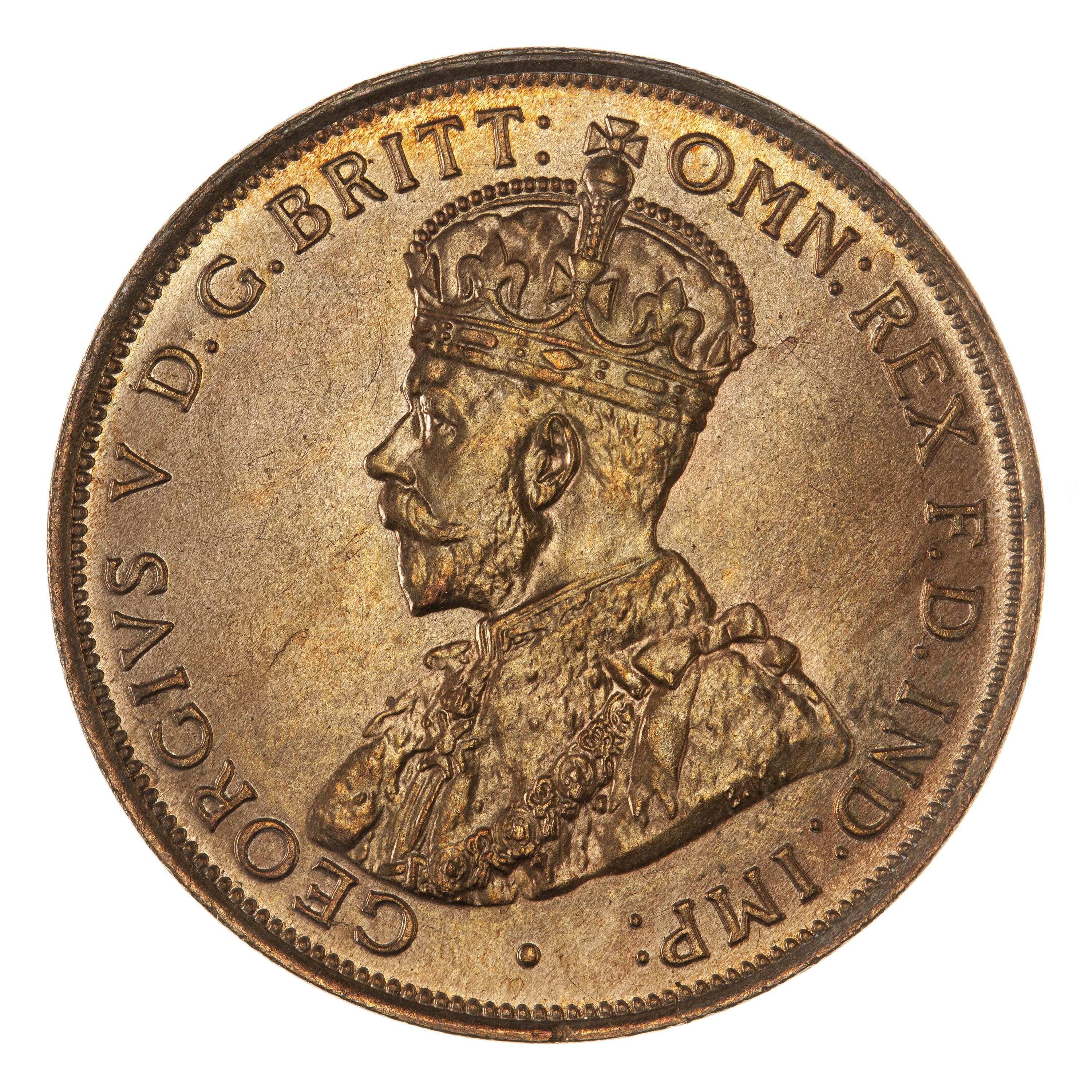 Crowned and draped bust of the King facing left; around, GEORGIVS V D.G. BRITT: OMN: REX F.D. IND: IMP:; the artist's initials, BM, on the bust truncation
