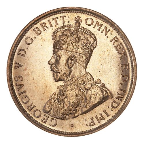 Crowned and draped bust of the King facing left; around, GEORGIVS V D.G. BRITT: OMN: REX F.D. IND: IMP:; the artist's initials, BM, on the bust truncation