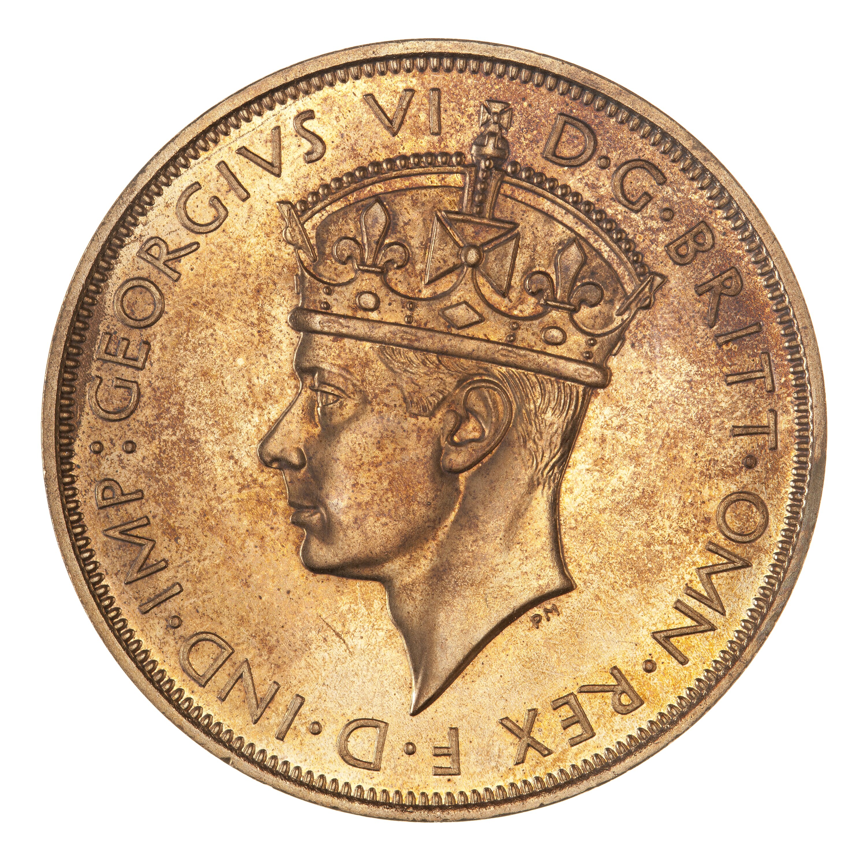 Crowned head of the King facing left; around, GEORGIVS VI D.G. BRITT. OMN. REX F.D. IND. IMP:; the artist's initials, PM, below neck