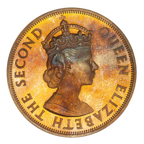 Crowned and draped bust of the Queen facing right; around, QUEEN ELIZABETH THE SECOND, the artist's initials, CT, incuse on bust truncation.