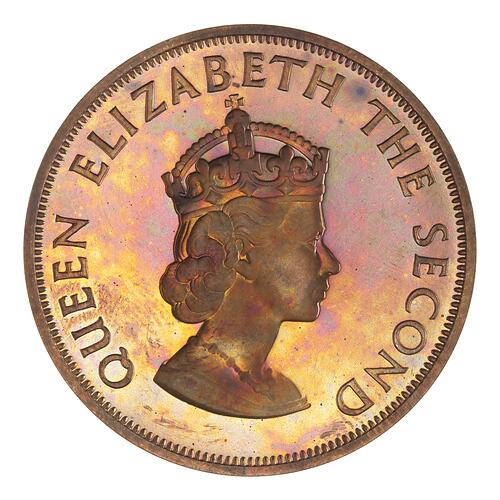 Crowned and draped bust of the Queen facing right; around, QUEEN ELIZABETH THE SECOND, the artist's initials, CT, incuse on bust truncation.