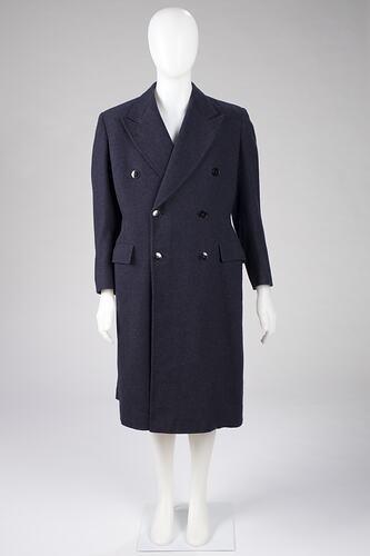 Dark blue, lined, double-breasted, overcoat made of wool. Pockets on front at hip with flaps. Six black buttons on front; three black buttons at the cuff of each sleeve. Printed label attached on inside at collar.