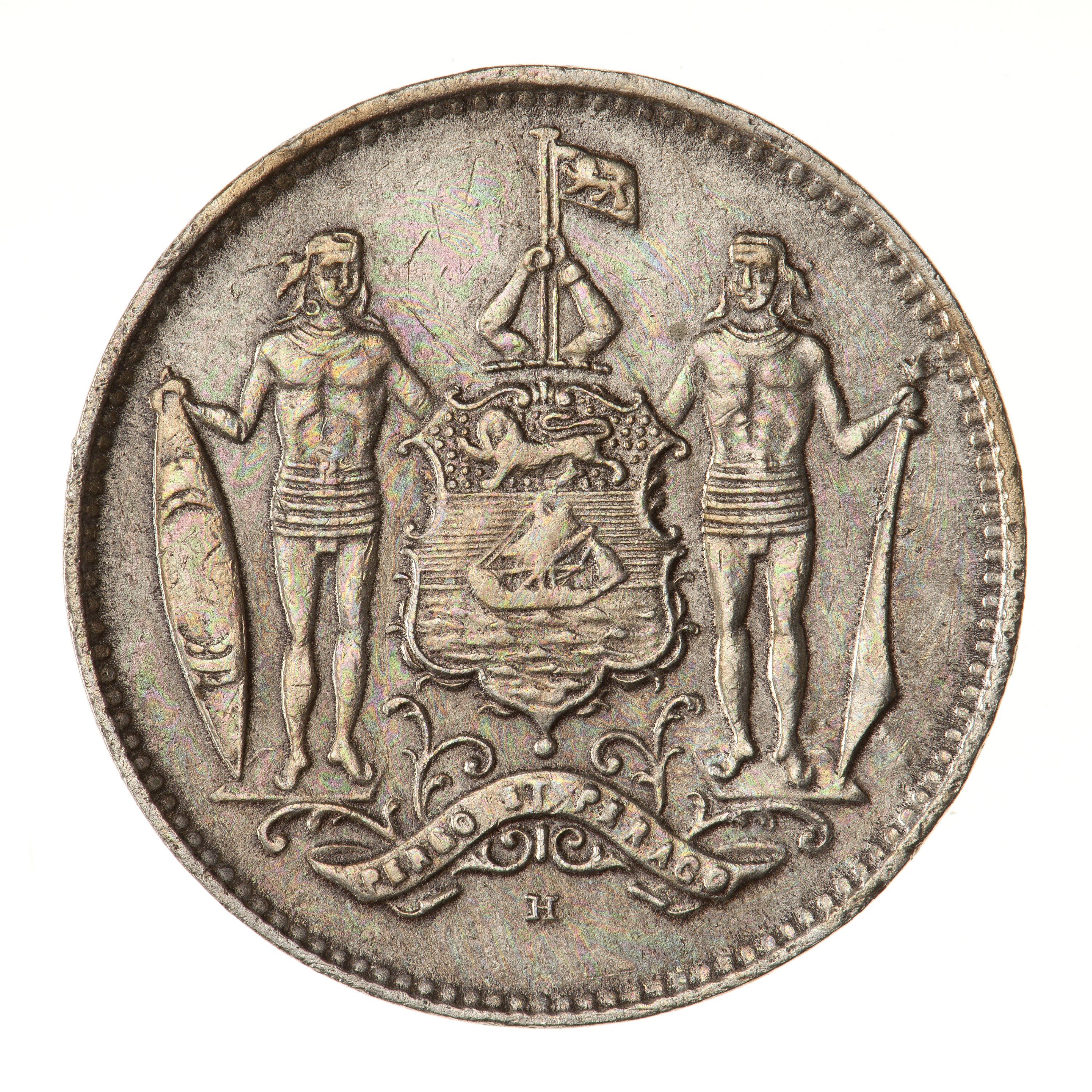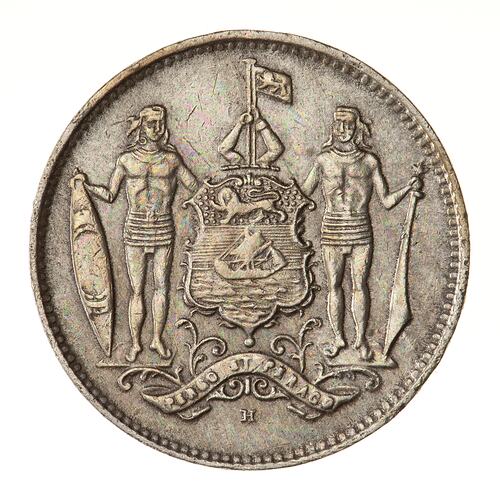 Shield of arms of the British North Borneo Company; on shield, a lion above a dhow; native warrior supporters one holding a shield the other as large machete; the crest, two arms holding a flag staff; below on ribbon the motto PERGO ET PERAGO (translation: I undertake and I achieve); below, the mint mark, H
