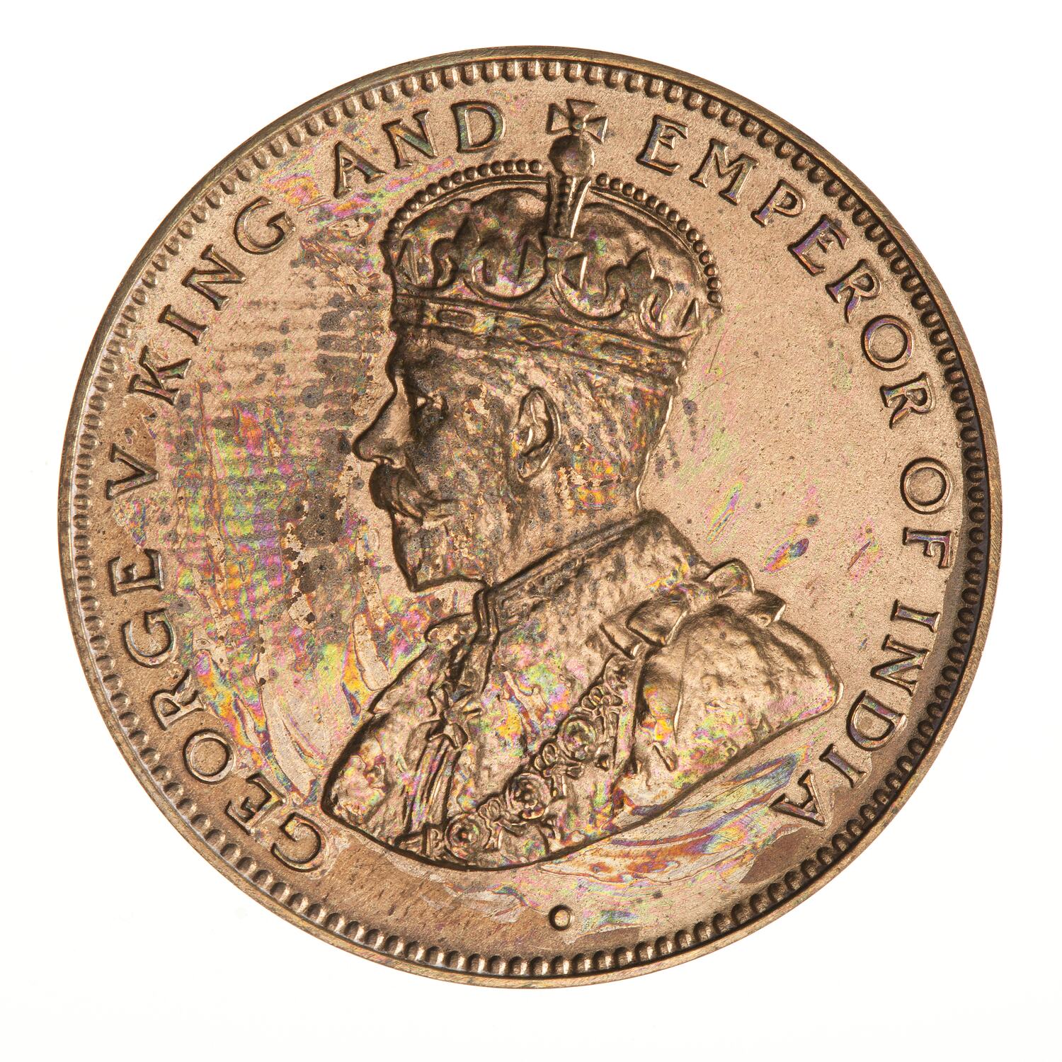 Crowned and draped bust of the King facing left, the King is wearing the Imperial Crown and the ermine Robe of State, the Collar of the Most Noble Order of the Garter, and the Badge of the Most Honourable Order of the Bath; around, GEORGE V KING AND EMPEROR OF INDIA; on bust truncation, the artist's initials, BM