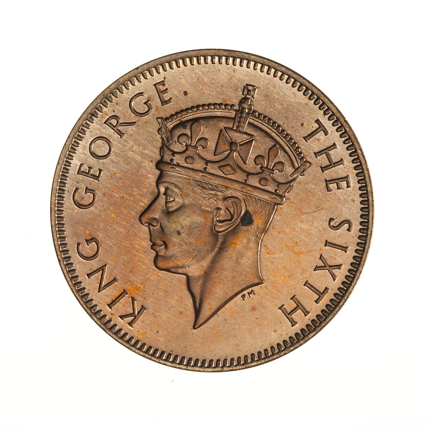 Crowned head of the King facing left; around, KING GEORGE THE SIXTH; the artist's initials, HP, below neck truncation
