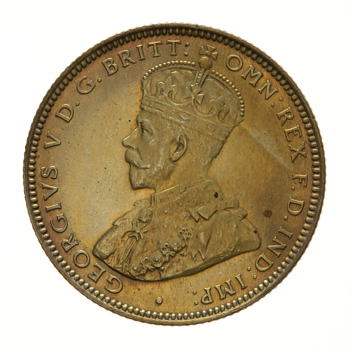 Crowned and draped bust of the King facing left, the King is wearing the Imperial Crown and the ermine Robe of State, the Collar of the Most Noble Order of the Garter, and the Badge of the Most Honourable Order of the Bath; around, GEORGIVS V D.G. BRITT: OMN: REX F.D. IND: IMP:; artist's initials BM on bust truncation