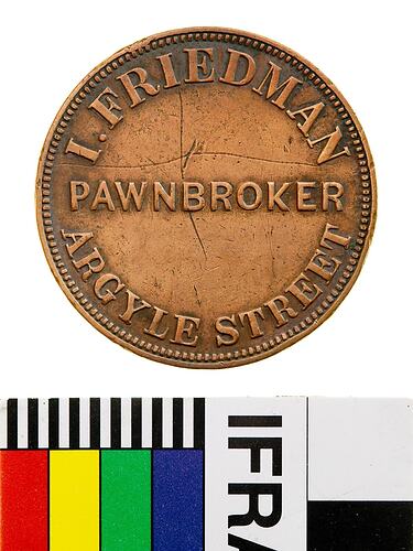Copper One Penny Token, minted by W.J. Taylor, London. Issued by I. Friedman, Pawnbroker, Hobart, Tasmania, in 1857. Isaac Friedman, was living in Hobart by 1840 and commenced business as a shopkeeper and general Pawnbroker in 1843. He had married Maria Nathan in 1842 and they had eight children, all born in the Hobart area, between 1842 and 1858. Friedman was a significant person in the Hobart Jewish community, in 1842, he kept a public house where the meeting was held that led to the construction of the Hobart Synagogue. His name is recorded on a tablet inside the Synagogue as one of the members of the Hobart Hebrew Congregation's committee in 1843.