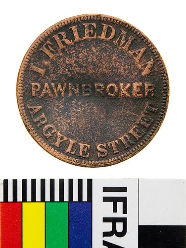 Copper One Penny Token, minted by W.J. Taylor, London. Issued by I. Friedman, Pawnbroker, Hobart, Tasmania, in 1857. Isaac Friedman, was living in Hobart by 1840 and commenced business as a shopkeeper and general Pawnbroker in 1843. He had married Maria Nathan in 1842 and they had eight children, all born in the Hobart area, between 1842 and 1858. Friedman was a significant person in the Hobart Jewish community, in 1842, he kept a public house where the meeting was held that led to the construction of the Hobart Synagogue. His name is recorded on a tablet inside the Synagogue as one of the members of the Hobart Hebrew Congregation's committee in 1843.