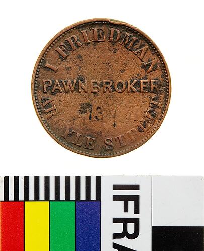 Copper Halfpenny Token, minted by W.J. Taylor, London. Issued by I. Friedman, Pawnbroker, Hobart, Tasmania, in 1857. Isaac Friedman, was living in Hobart by 1840 and commenced business as a shopkeeper and general Pawnbroker in 1843. He had married Maria Nathan in 1842 and they had eight children, all born in the Hobart area, between 1842 and 1858. Friedman was a significant person in the Hobart Jewish community, in 1842, he kept a public house where the meeting was held that led to the construction of the Hobart Synagogue. His name is recorded on a tablet inside the Synagogue as one of the members of the Hobart Hebrew Congregation's committee in 1843.