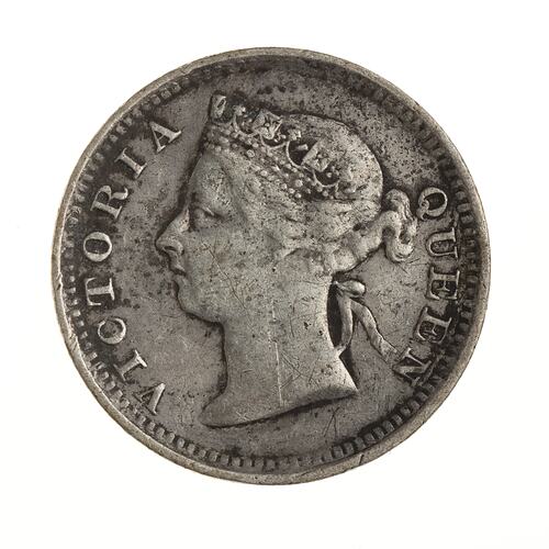 The 5 cents denomination was introduced in 1866 and struck at the Hong Kong mint until its closure in 1868. Thereafter the coins were struck in Britain, either at the Royal Mint, London or at Heaton & Sons, Birmingham.