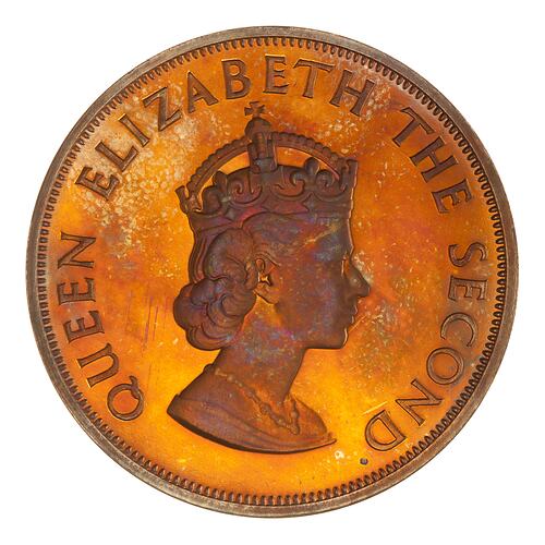 Crowned and draped bust of the Queen facing right; around above, QUEEN ELIZABETH THE SECOND, the artist's initials, CT, incuse on bust truncation.