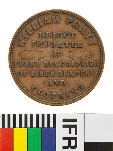 Obverse: WILLIAM PRATT DIRECT IMPORTER OF EVERY DESCRIPTION OF LINEN DRAPERY AND CLOTHING Reverse: DUNSTABLE HOUSE ESTABLISHED 1854 CASHEL STREET CHRISTCHURCH