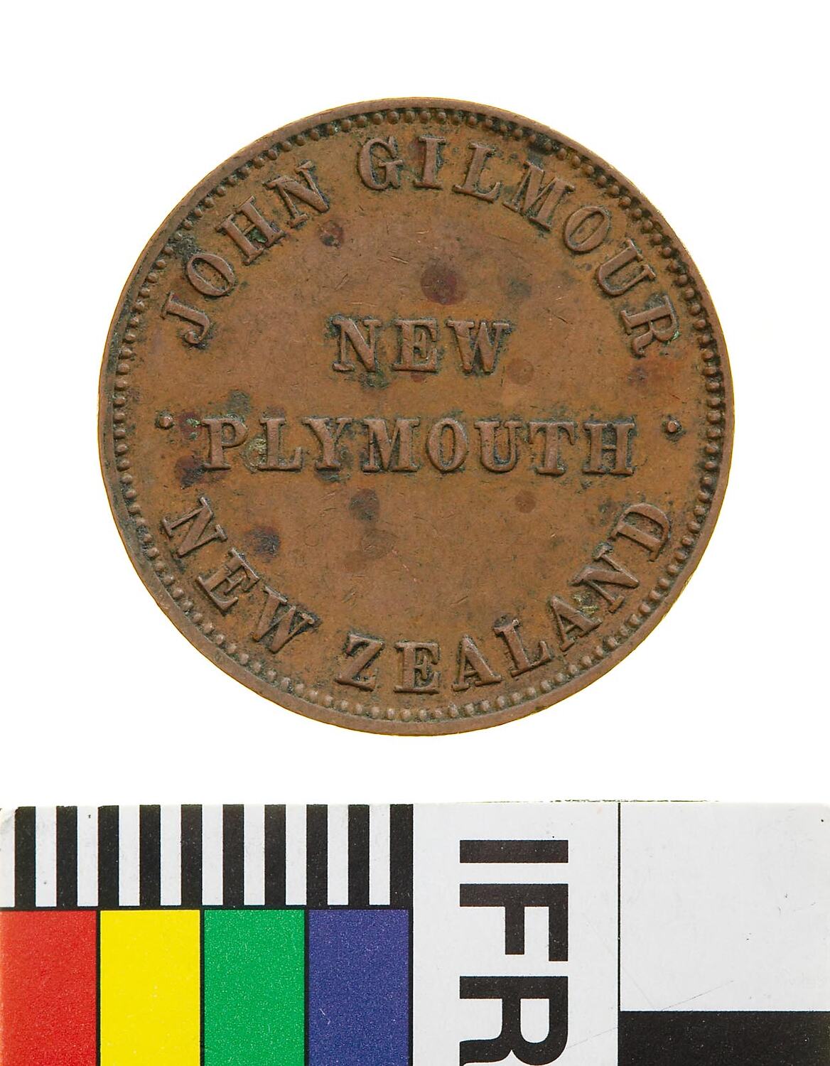 A round bronze token (31 mm diameter). The piece features the name and address (but not the business) of the issuer: John Gilmour, New Plymouth, New Zealand. The reverse depicts the seal of New Plymouth which includes Mt. Egmont in the background.